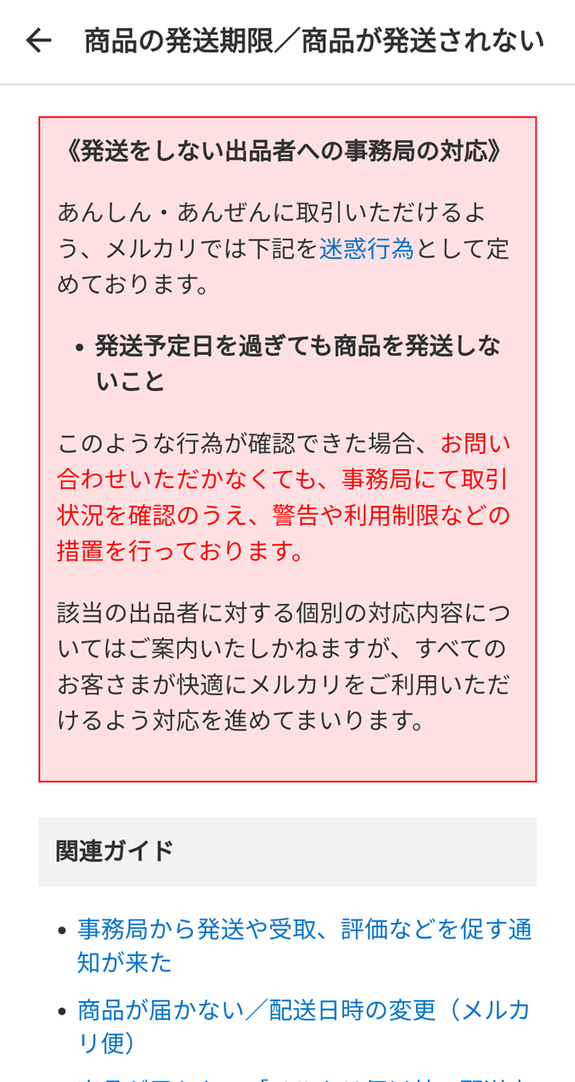 メルカリでは「発送予定日を過ぎても商品を発送しない」ことを、迷惑行為としています。