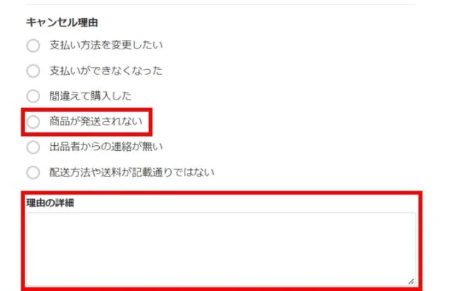 2.キャンセル理由で「商品が発送されない」を選択のうえ、「理由の詳細」を入力する