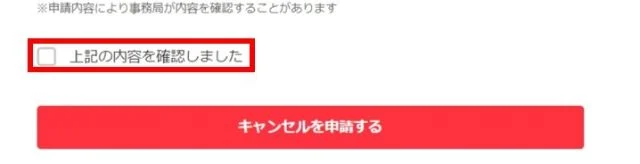 「上記の内容を確認しました」にチェックのうえ、「キャンセルを申請する」をタップする