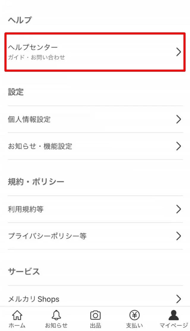 右下の「マイページ」をタップ後、「ヘルプ」内にある「ヘルプセンター ガイド・問い合わせ」を選択する