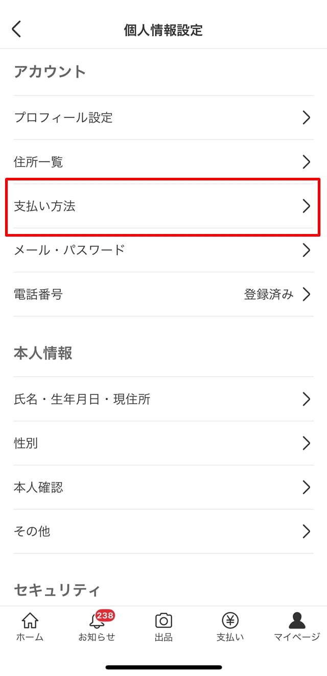 支払い方法の登録は、マイページの「個人情報設定」から「支払い方法」の画面を開いて設定しましょう。