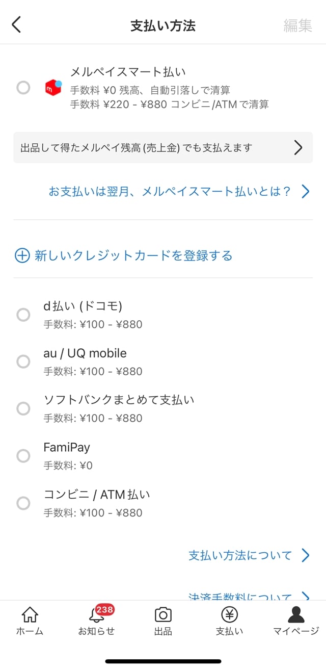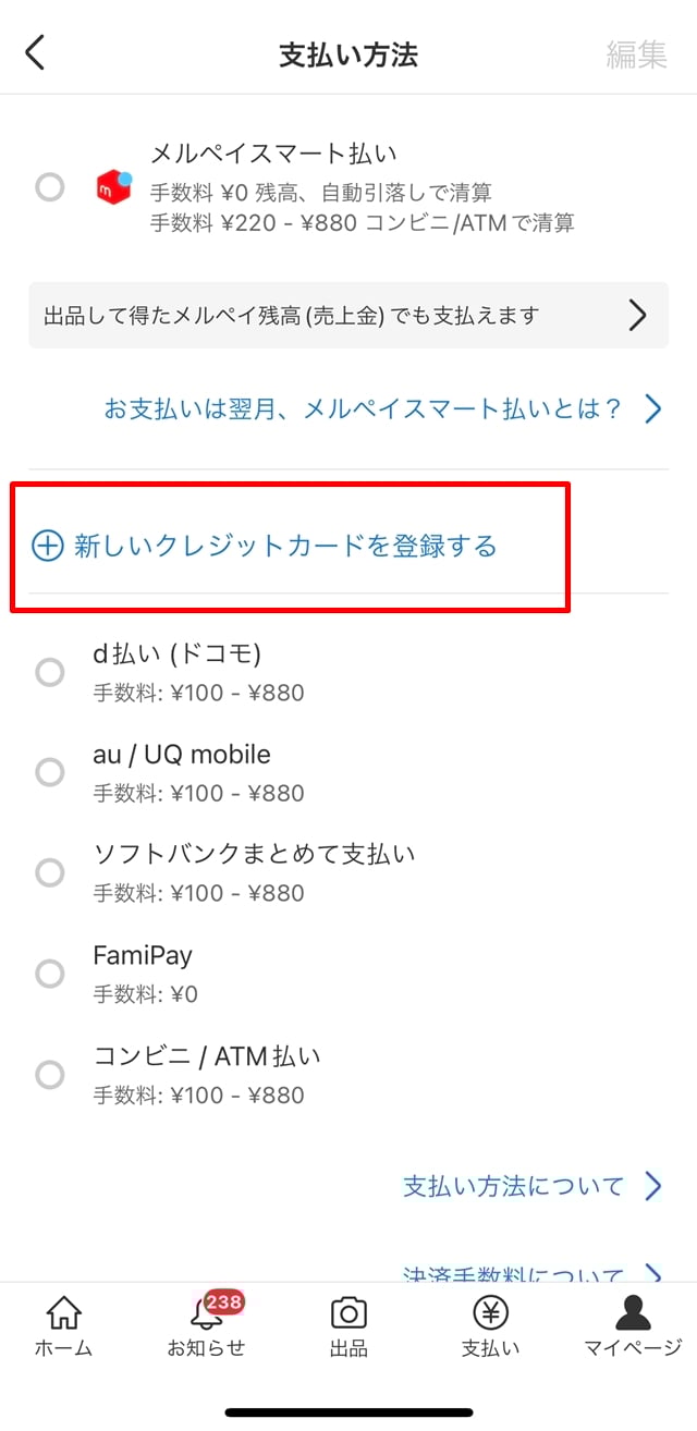 ※メルカードの場合はクレジットカード払いではなく、「メルペイのあと払い」に分類されるので、この後の解説を参考にしてください。
