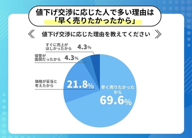 値下げ交渉に応じた理由で最も多かったのが、「早く売りたかったから」でした。「即決」自体は不快感をもたれる可能性のある言葉ですが、早く売ってしまいたいと思っているユーザーに対しては、有効なケースも存在するようです。
