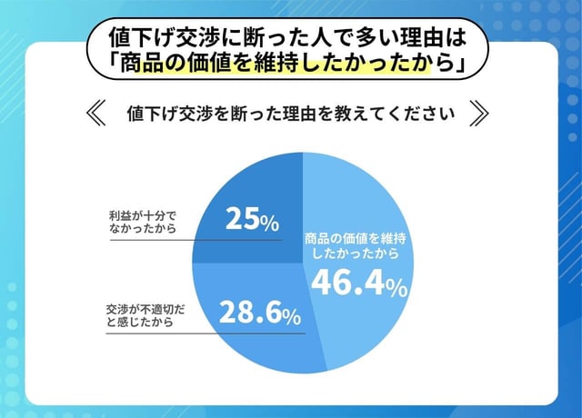逆に、値下げ交渉を断った理由では、「商品の価値を維持したかったから」が一番多くなりました。「〇〇円値下げなら即決します」と言う人に対しては、相手に言われるまま商品を値下げするのに抵抗感を覚える人が多いようです。