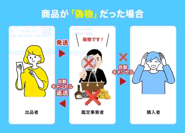 この場合、取引は自動でキャンセルになるため、購入者が支払った商品代金と鑑定料金は返金されるしくみです。