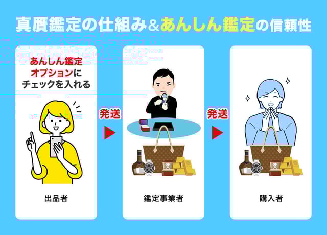 メルカリのあんしん鑑定は、出品者・購入者の双方が安心して高額商品を取引できる仕組みです。