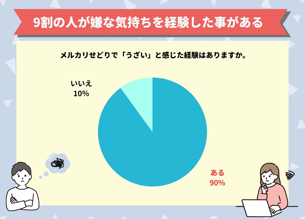 アンケートによると、9割の人がメルカリせどりで「うざい」と感じたことがある結果になったため、ほとんどの人がなんらかの理由で不快な思いをしているとわかります。