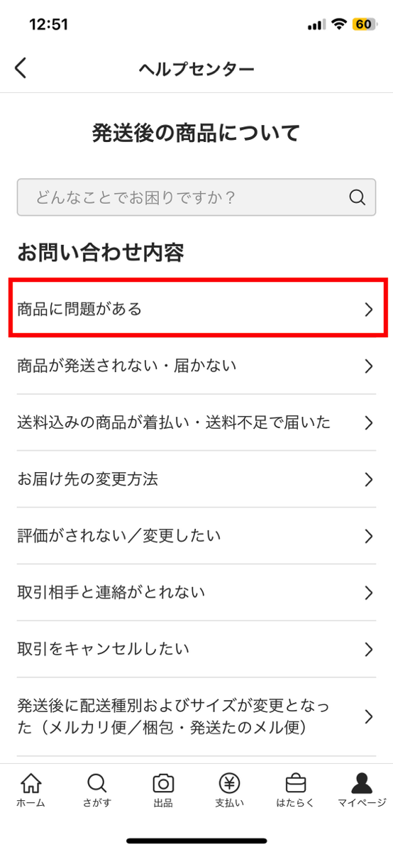- 「購入した商品について」>「発送後の商品について」>「商品に問題がある」>「商品が配送中に破損して届いた(メルカリ便)」