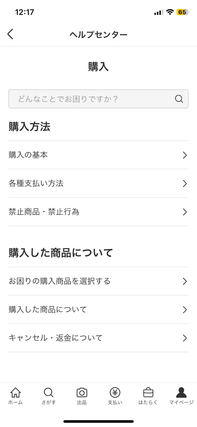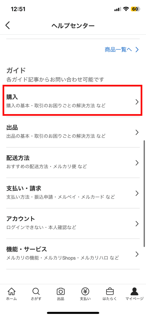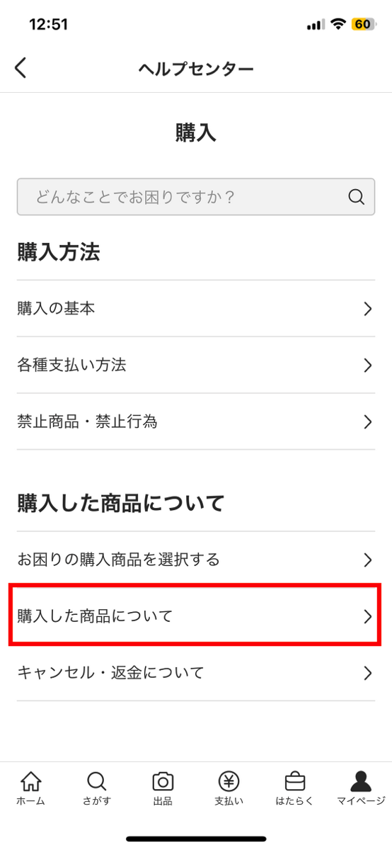 問い合わせる場合は「マイページ」からヘルプセンターに進み、問い合わせたい商品を選択して返品に関する項目を選択して問い合わせが可能です。過去に取引した商品であれば「商品一覧へ」をタップすることで確認できます。