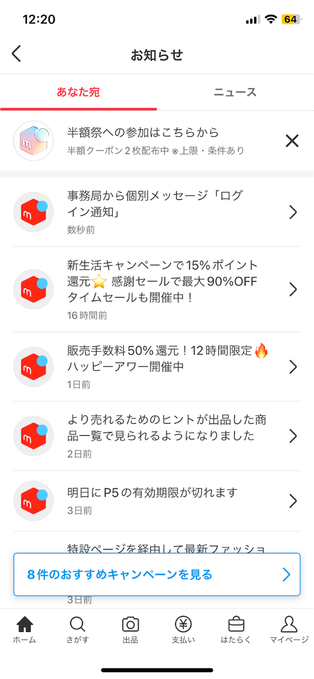 メルカリ事務局からの回答は、ホームの画面右上に位置する「お知らせ」(ベルのアイコン)に通知されます。また、「マイページ」のヘルプセンターにある、過去の問い合わせ履歴からでも確認できます。