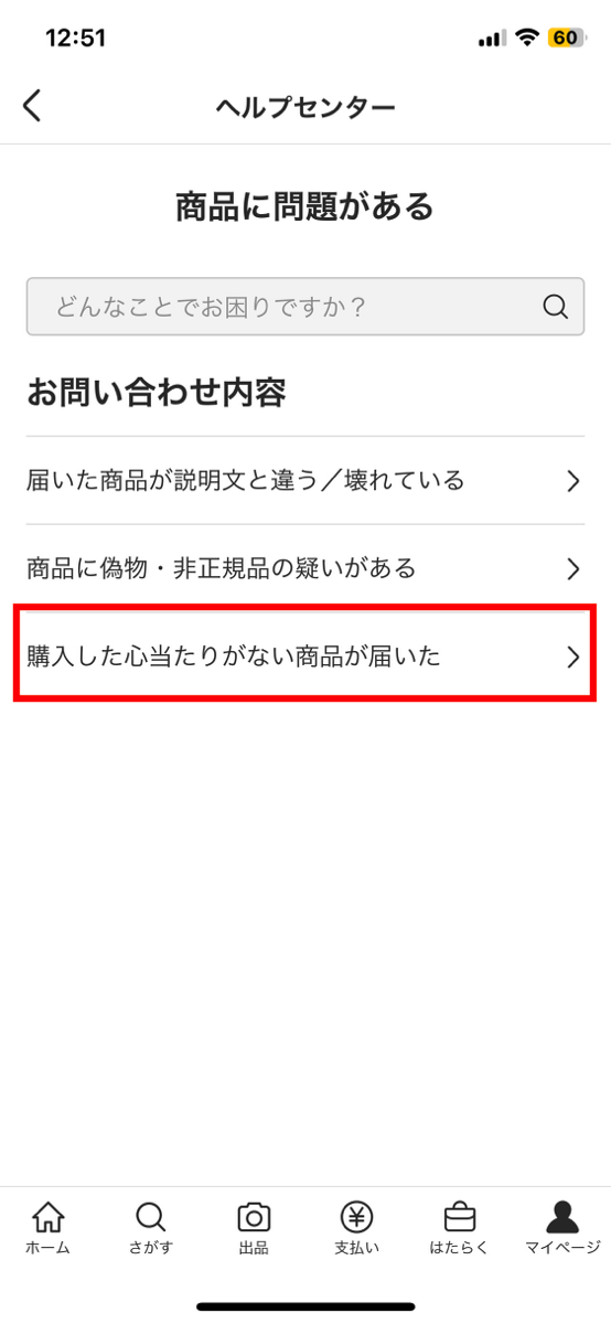 「購入した商品について」>「発送後の商品について」>「商品に問題がある」>「購入した心当たりのない商品が届いた」