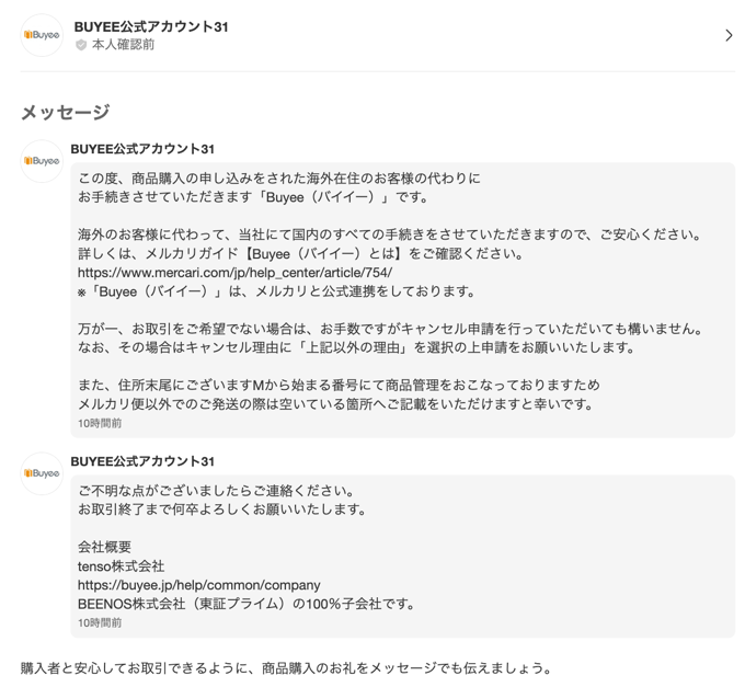 Buyeeが出品商品を購入すると、出品者宛にメルカリの公式バイヤーである旨のメッセージが届き、安心安全のためとして「名前を教えてほしい」と記載されています。