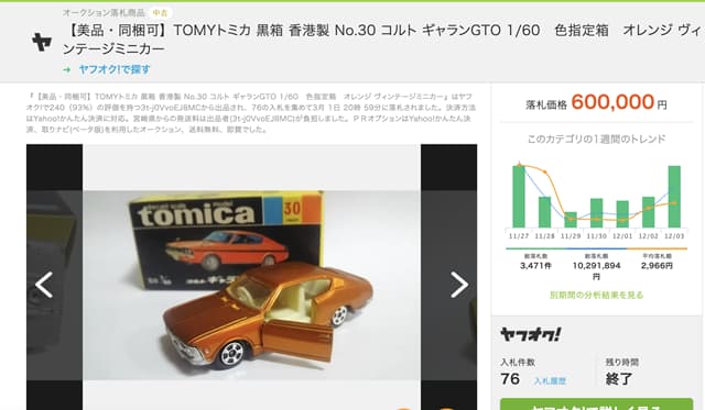 例えば香港製トミカのコルトギャランは、なんと60万円もの金額で落札されています。