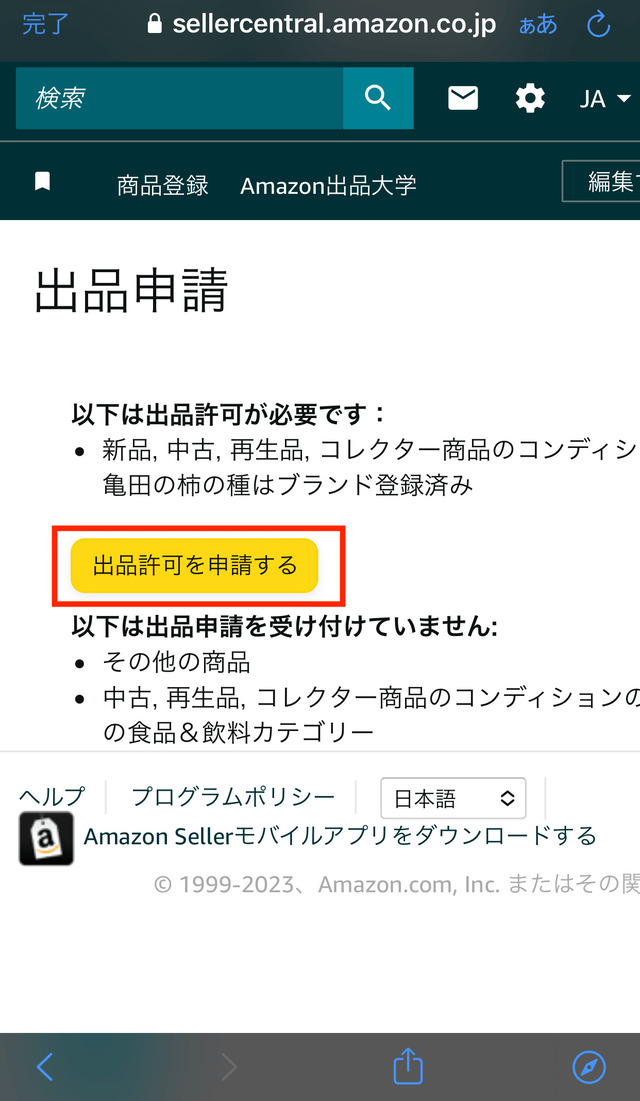 「出品許可申請はこちら」をタップすると、Amazonの出品申請の画面に移動します。