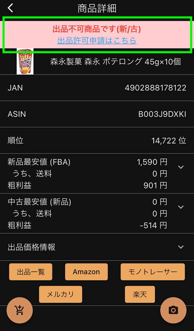 商品画面の「出品確認」のタブをタップすると、出品制限の有無を確認できます。出品制限のかかっている商品は、商品画面から出品制限の解除画面に移動できるため、非常に便利です。