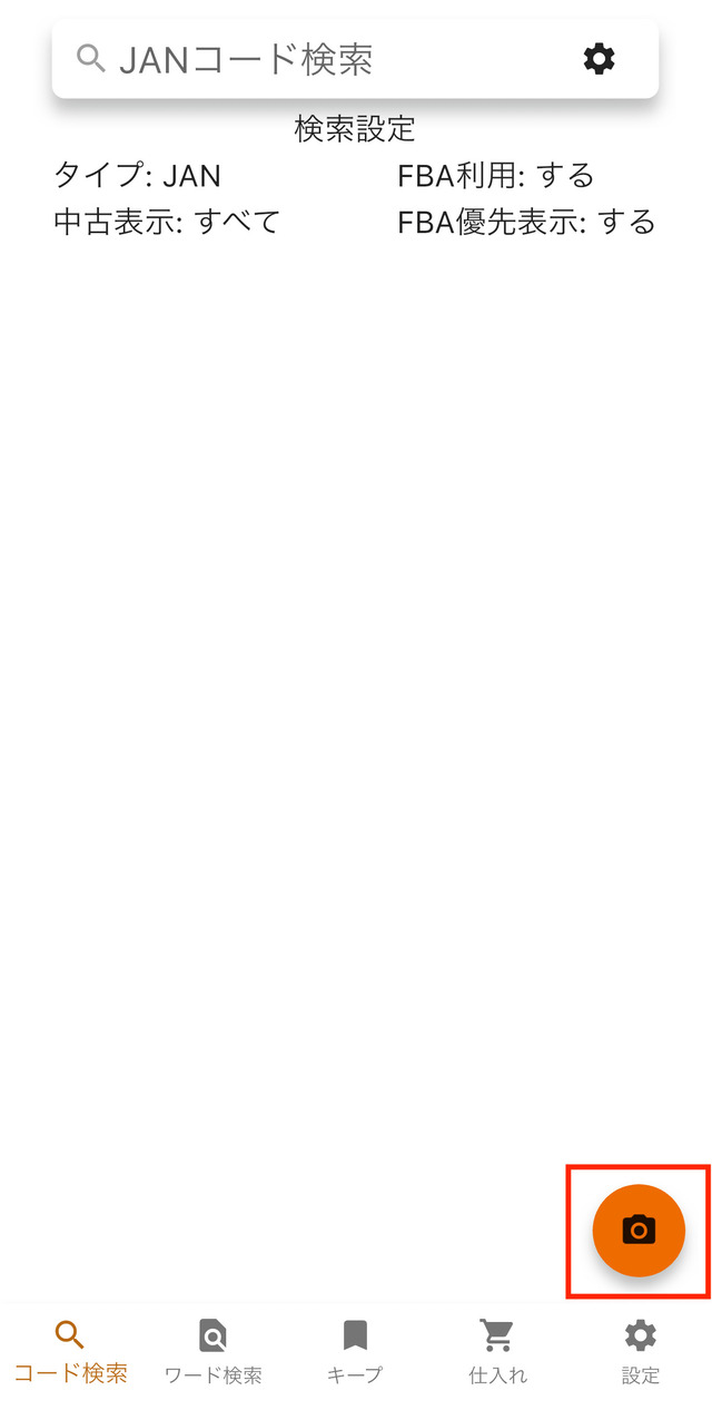 トップ画面右下のカメラマークをタップすると、カメラが起動してバーコードを読み取る画面が表示されます。