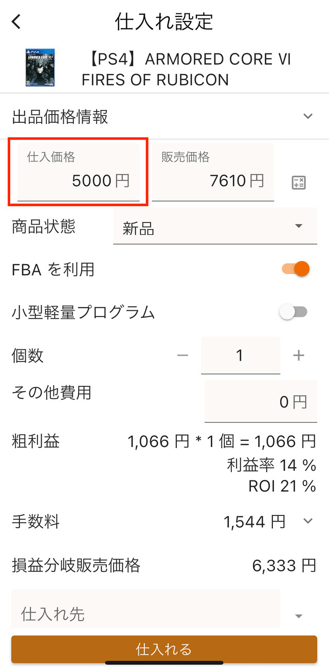 商品のカートマークをタップして仕入れ値やFBA利用の有無などを入力することで、正確な利益計算が可能です。