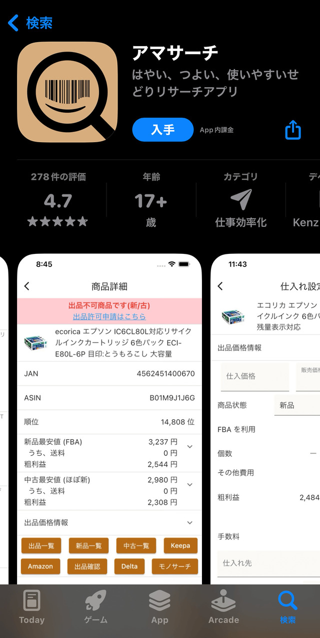 アマサーチは、店舗せどりで使えるリサーチアプリです。