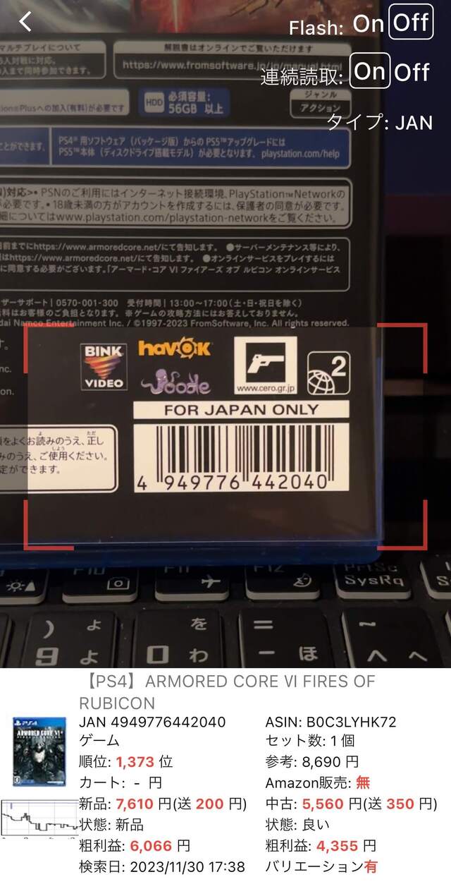 赤枠の部分に商品バーコードを合わせると、Amazonでの価格や粗利益が表示されます。