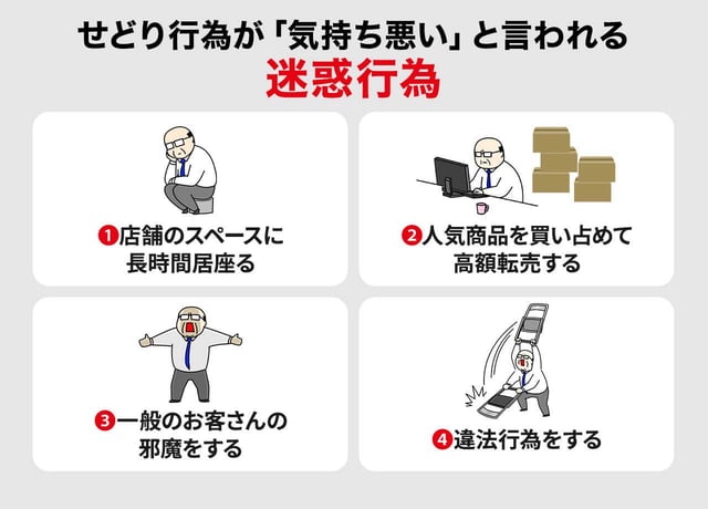 入荷する新商品の買い占めのためや、高く売れる商品を探すためのリサーチなどで、店舗のスペースに居座る行為はほかのお客さんの邪魔となり迷惑です。長時間居座ることによって、普通に商品を買いたい人や本当に商品を必要な人が買えなくなってしまいます。
