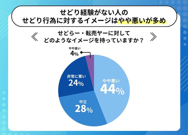 アンケートの結果、せどり経験がない人たちの一番多い印象は「やや悪い」の44%でした。次に「中立」と「非常に悪い」が続き、「やや良い」と答えた人は全体の4%で「非常に良い」印象はありませんでした。このことからせどりを行っていない人からは、せどりに対してはマイナスのイメージが強いことがわかります。