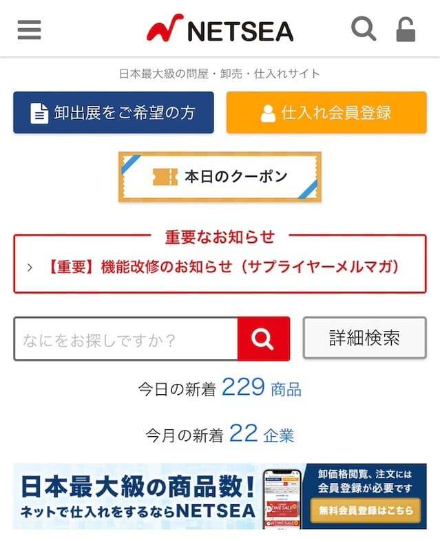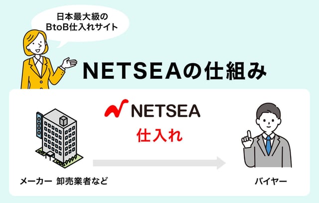 NETSEAは、日本最大級のBtoB仕入れサイトで、バイヤー(仕入れ側)とサプライヤー(卸売り側)を結びつけるプラットフォームです。