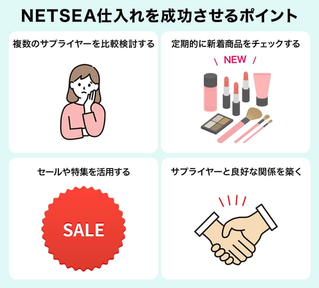 NETSEAを使った仕入れを本格的に始めるなら、ただ商品を選ぶだけではなく、仕入れの精度と効率を高める工夫が欠かせません。ここでは、仕入れを成功させる重要ポイントを4つ紹介します。