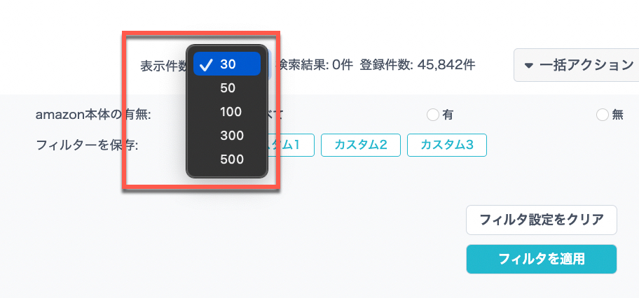 条件を入力して『フィルタを適用』をクリックすることで、登録した莫大な商品から条件に当てはまったリストだけを表示することができます。