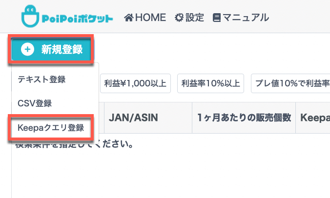 『新規登録』→『Keepaクエリ登録』をクリックします。