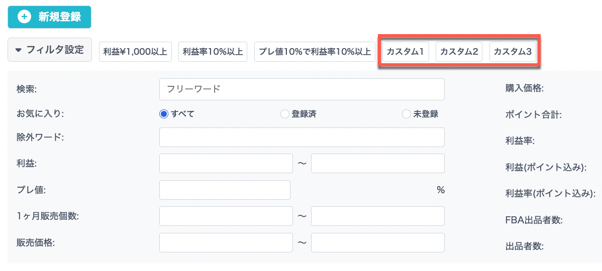 『利益¥1,000以上』『利益率10%以上』『プレ値10%で利益率10%以上』のボタンをクリックすることで、フィルタ条件を入力しなくても条件に合った商品を表示させることができます。